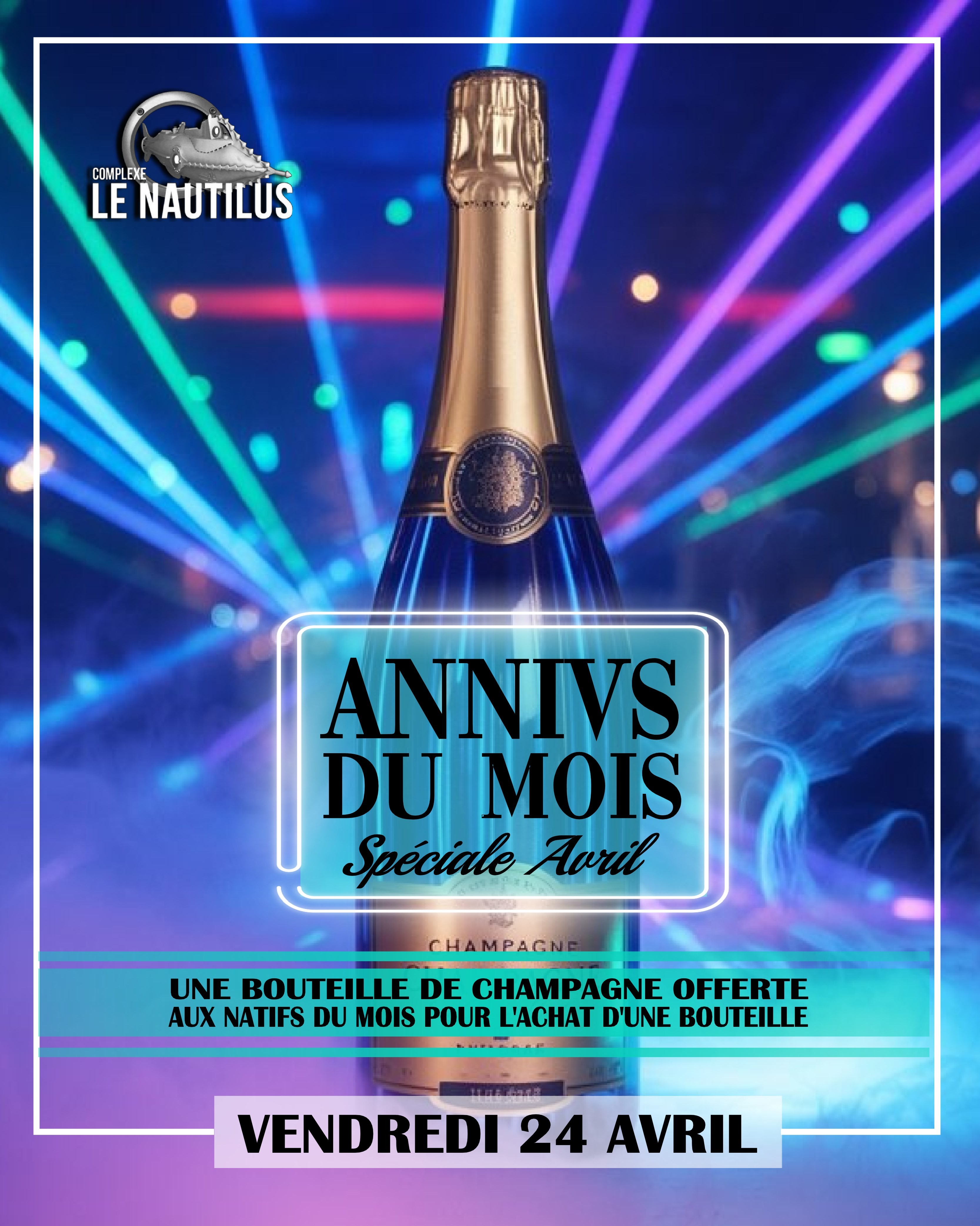 🥳🎈 LES ANNIV' DU MOIS 🥳🎈 La mensuelle spéciale anniversaire ! Pour tous les natifs du mois de AVRIL : 1 bouteille achetée = 1 bouteille de champagne offerte 🍾 (sur présentation de la carte d’identité) RÉSERVEZ VOTRE TABLE : 04 77 25 25 25 ▬▬▬▬▬▬▬▬▬▬ Le Nautilus, un complexe unique dans la région! VENEZ DÉCOUVRIR NOTRE NOUVELLE TERRASSE ! ┋Restaurant, Terrasses [ Carte/Tapas/Cocktails ] ┋Le Galion : Dj Kimfan [ Tubes 80,90,2000 ] ┋L'Atlantide : Dj résident Antony [ Club, Latino, Urban ] REJOIGNEZ-NOUS : ☛ Site web: https://www.complexe-nautilus.com/ ☛ Facebook https://www.facebook.com/ComplexeLeNautilus/ ☛ Instagram https://www.instagram.com/complexelenautilus/ ▬▬▬▬▬▬▬▬▬▬ Complexe Le Nautilus 47 Rue Gutenberg 42100 Saint Etienne Info/Résa ✆ : 04 77 25 25 25 Entrée 10 € avec une consommation